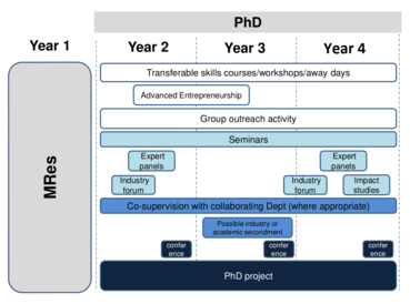 CDT students will spend around 80-90% of their time on their core research. The remaining 10-20% of their time will be devoted to bespoke activities, which will include a mix of impact studies; possible secondment to an industrial or international academic partner; additional multi-disciplinary components e.g. with a co-supervisor from another Department/division; and advanced professional, personal and commercial skills development.